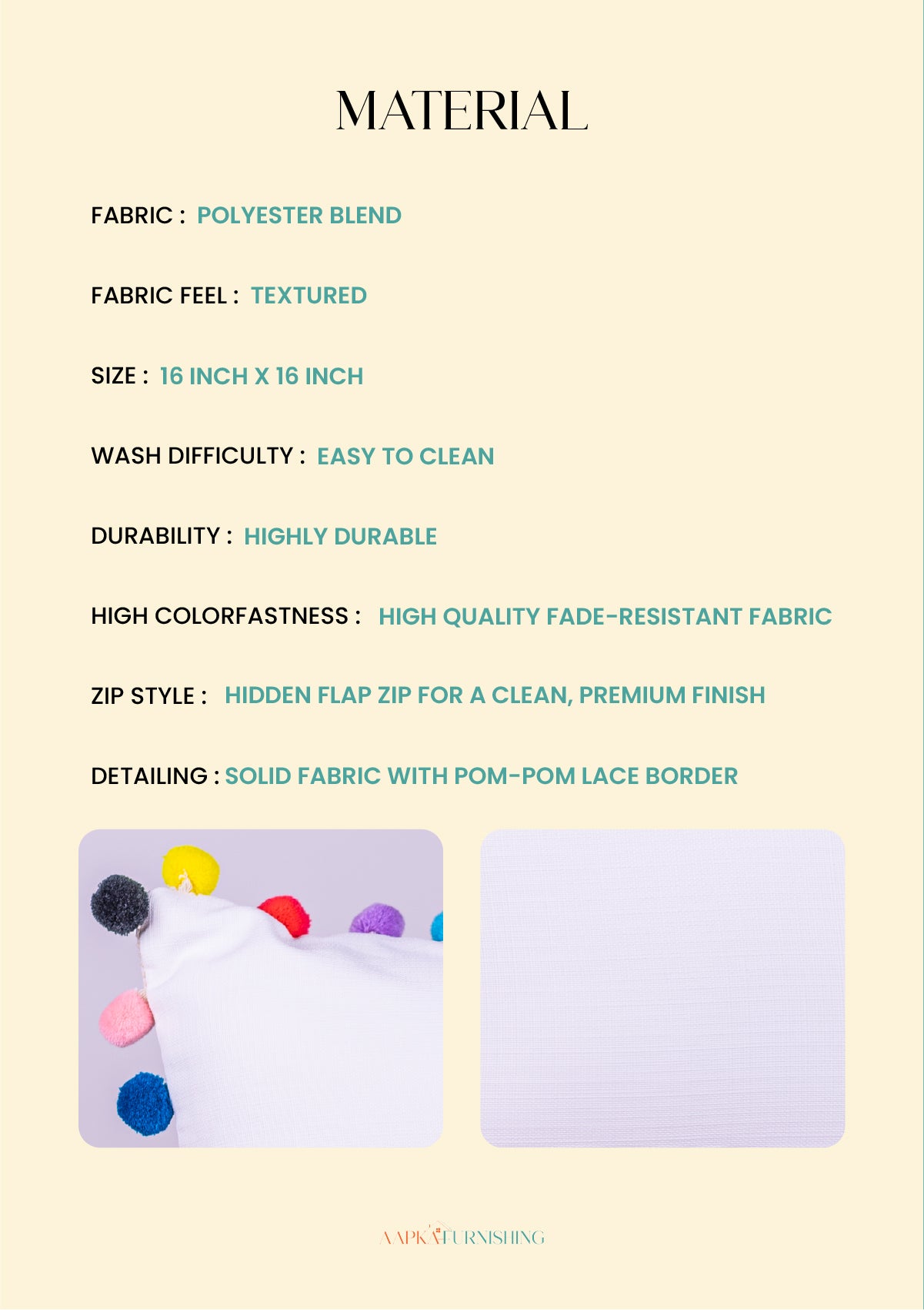 Add a playful touch to your décor with this white pom pom cushion cover made from a polyester blend fabric. It offers a textured feel and a clean look. Sized at 16x16 inches, it features high colorfastness for lasting color. The printed fabric with pom pom lace border enhances its charm, while the hidden flap zip ensures a neat finish. Easy to clean and perfect for modern homes.